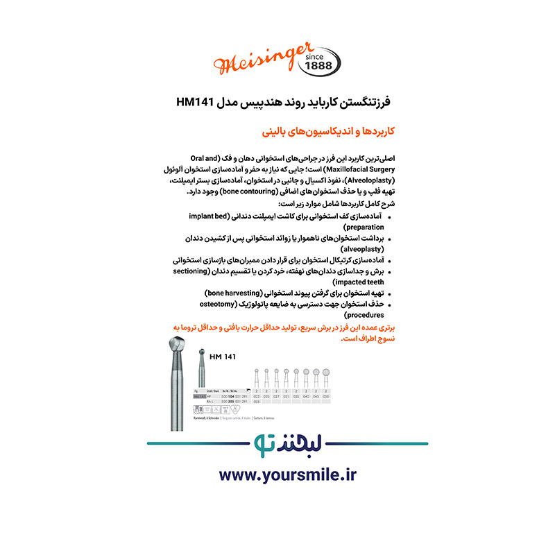 فرز HM141 HP Meisinger با داشتن جنس برتر (کاربید تنگستن فاین)، طراحی کروی با ۶ تیغه برش، شفت HP با استاندارد جهانی، رِنج سایزبندی کامل و اخذ گواهینامههای ISO 13485 و CE، از نظر بالینی یکی از دقیقترین، ماندگارترین و ایمنترین انتخابها برای جراحی دهان و فک و انواع کارهای پروتزی و لابراتوری است.
