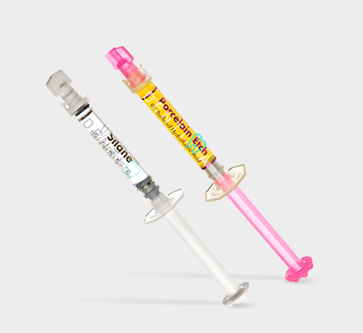 Porcelain Etch نود ثانیهای برای اچینگ ونیرها، بریجها، کراونها، پرسلنهای شکسته، اینله و انلهها استفاده میشود. Silane شصت ثانیهای بعد اچینگ هیدروفلوئوریک اسید برای آمادهسازی سطح اتصال رزین استفاده میشود. مطالعات نشان میدهند که استفاده از این دو محصول همراه با رزینهای باندینگ، قدرت و استحکام باندینگهای پرسلن را افزایش میدهد.