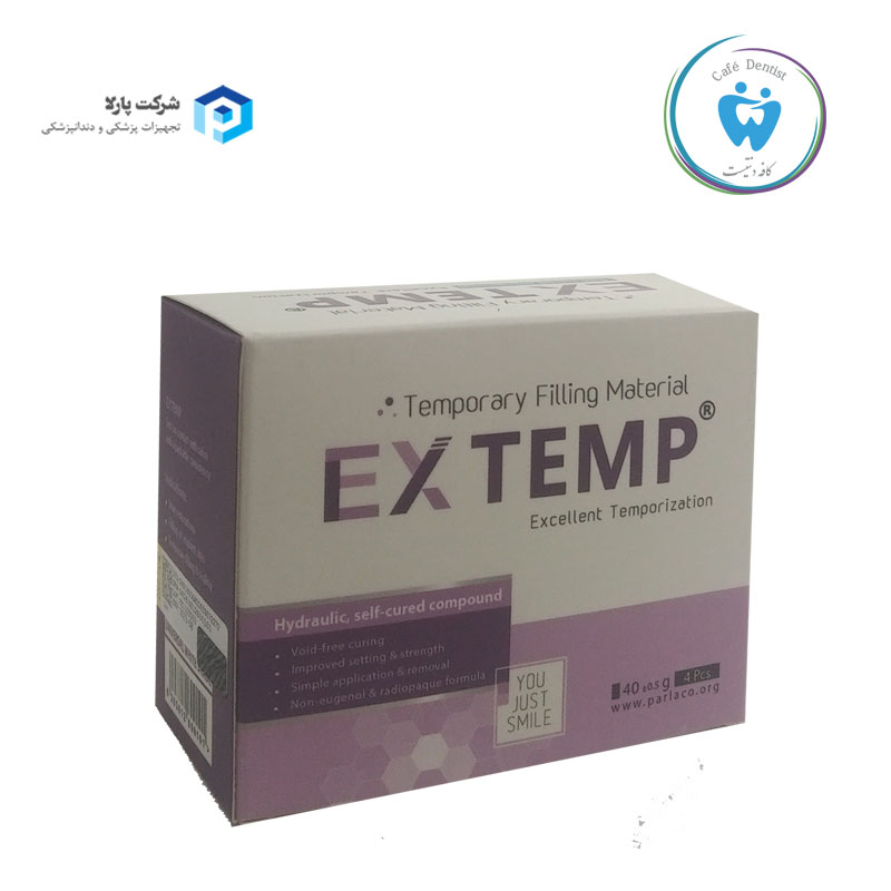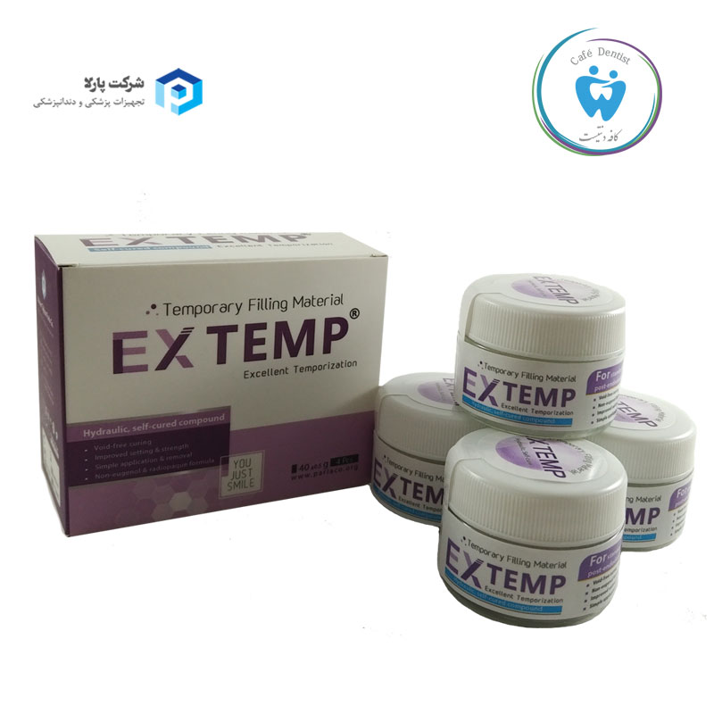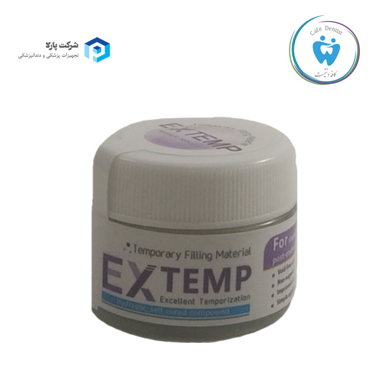 - EXTEMP یک نوع خمیر پانسمان رادیواُپک و تقویت شده بـا رزیـن است که در مجـاورت بـزاق دهــان و تحـت رطـوبـت سفت میشود. این محصـول به منظـور آب بندی و پرکردن موقت به کار میرود.